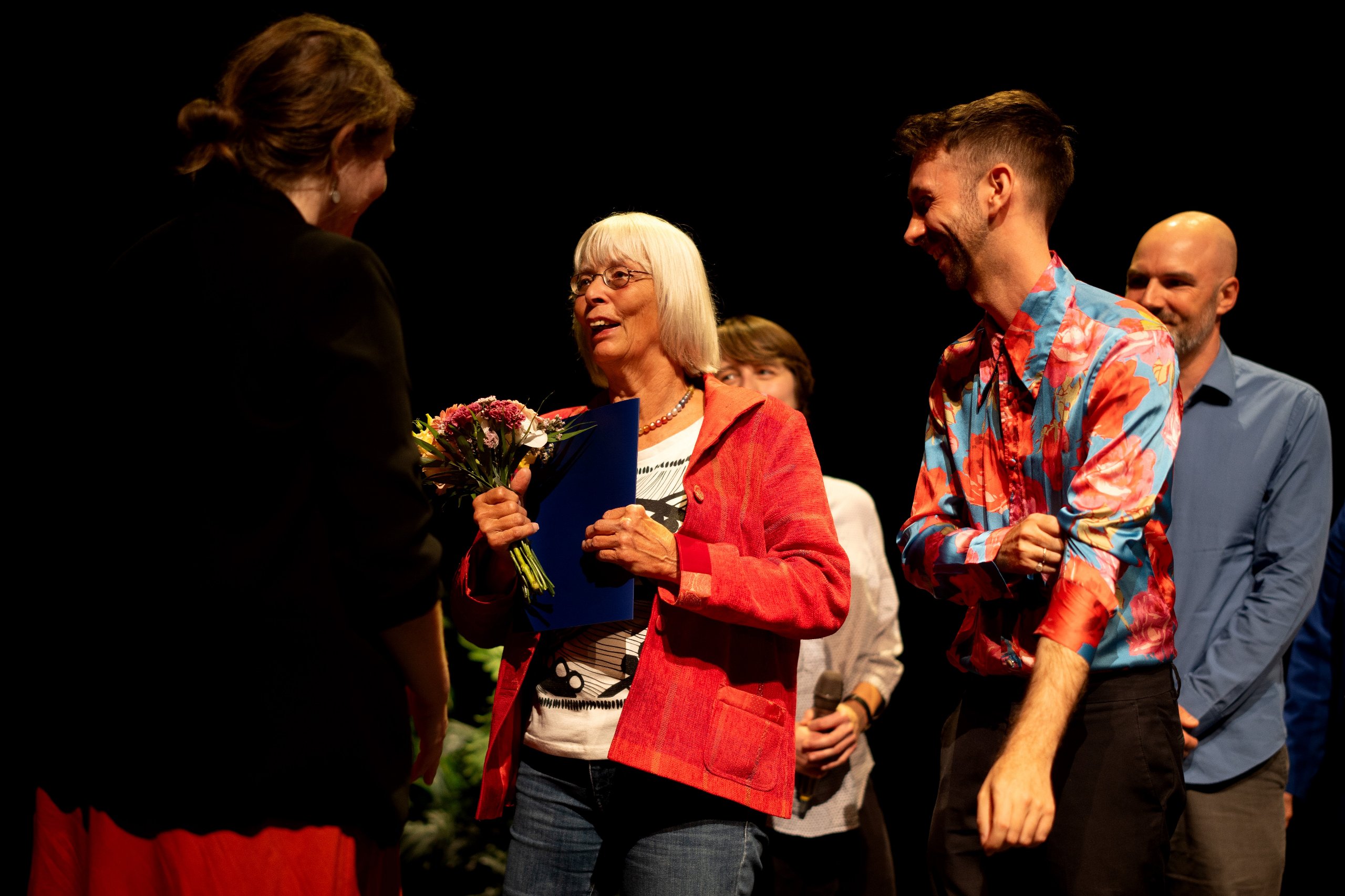 „Seit mehr als 30 Jahren engagiert sich Angelika Albrecht-Schaffer im Figurentheaterbereich: als Spielerin des Figurentheater Kladderadatsch, als Netzwerkerin der bayrischen Amateur-Figurentheaterszene und nun auch als Türöffnerin für die besondere Form des Lambe-Lambe-Theaters. Der Ehrenpreis wird nicht nur für ihre berührende Inszenierung ‚Tante Ernas Handtasche‘ für je eine Zuschauer:in zum Thema Demenz vergeben, sondern soll ihr langjähriges Engagement für die Amateur-Figurentheaterszene würdigen.“